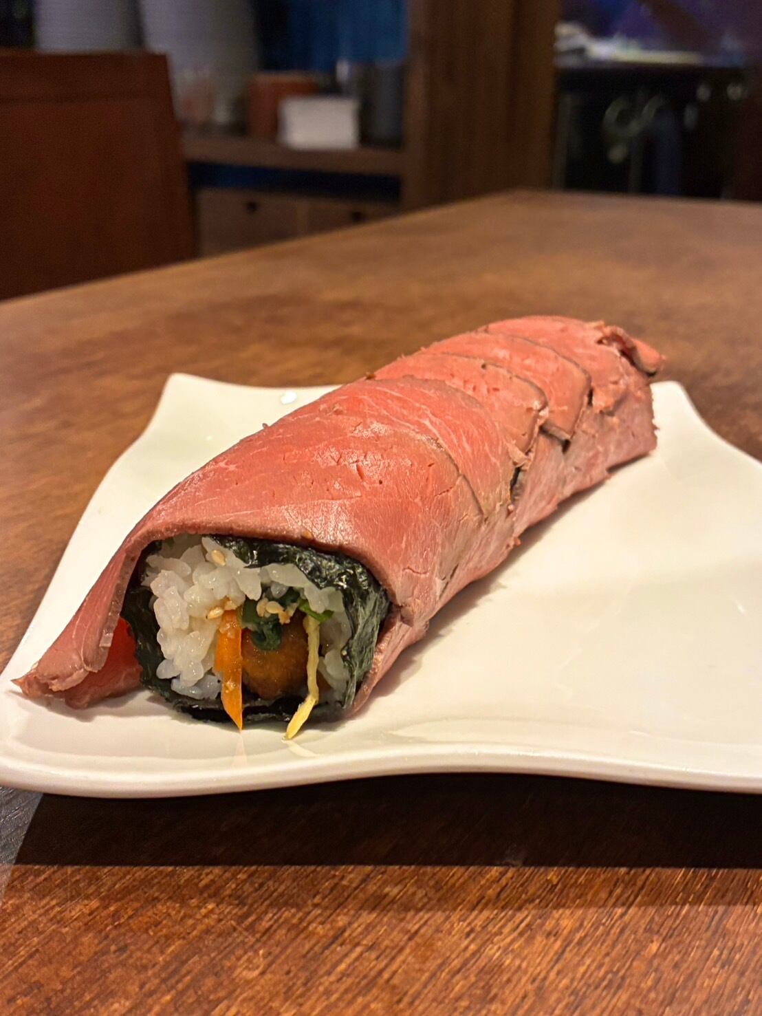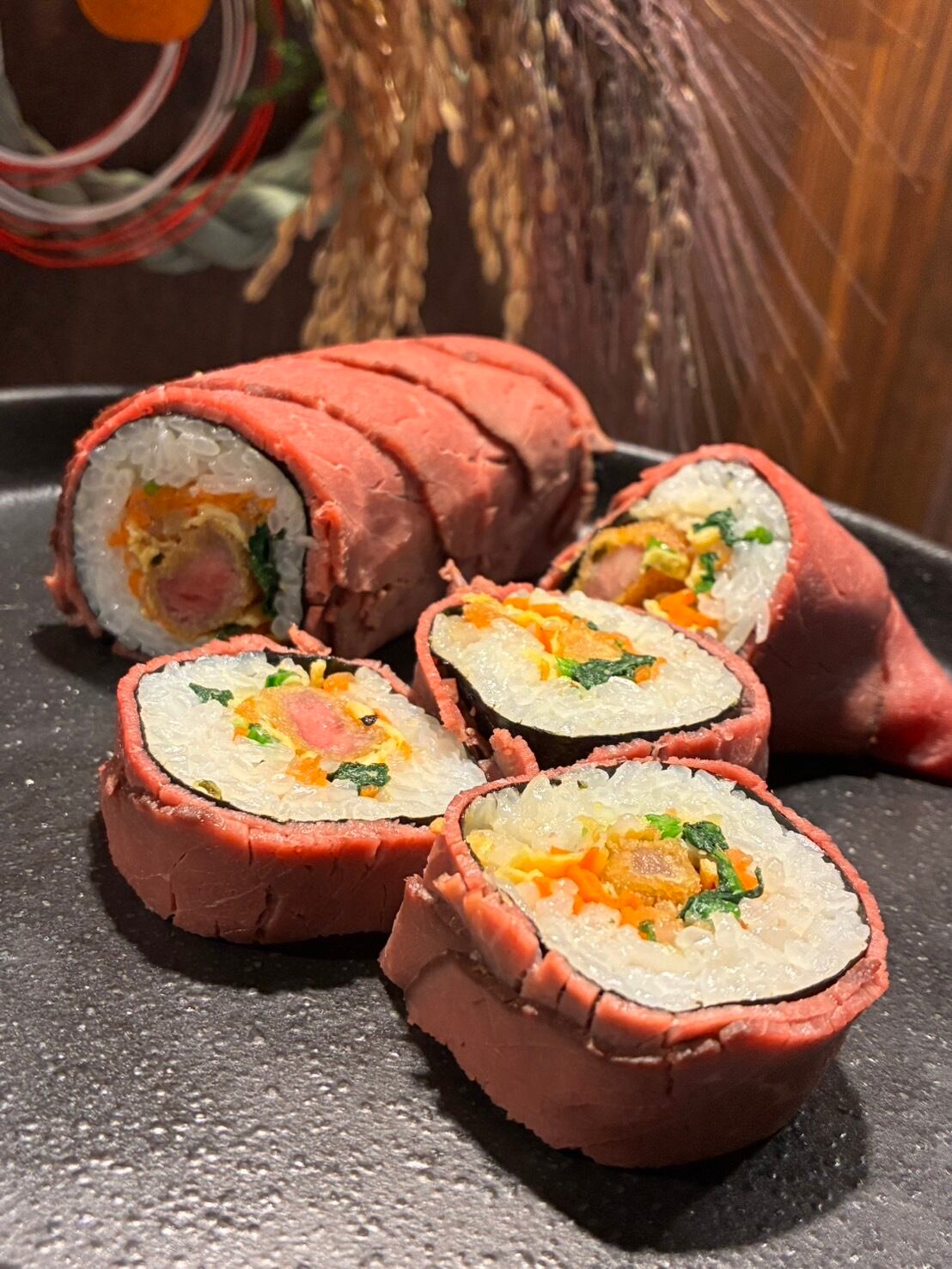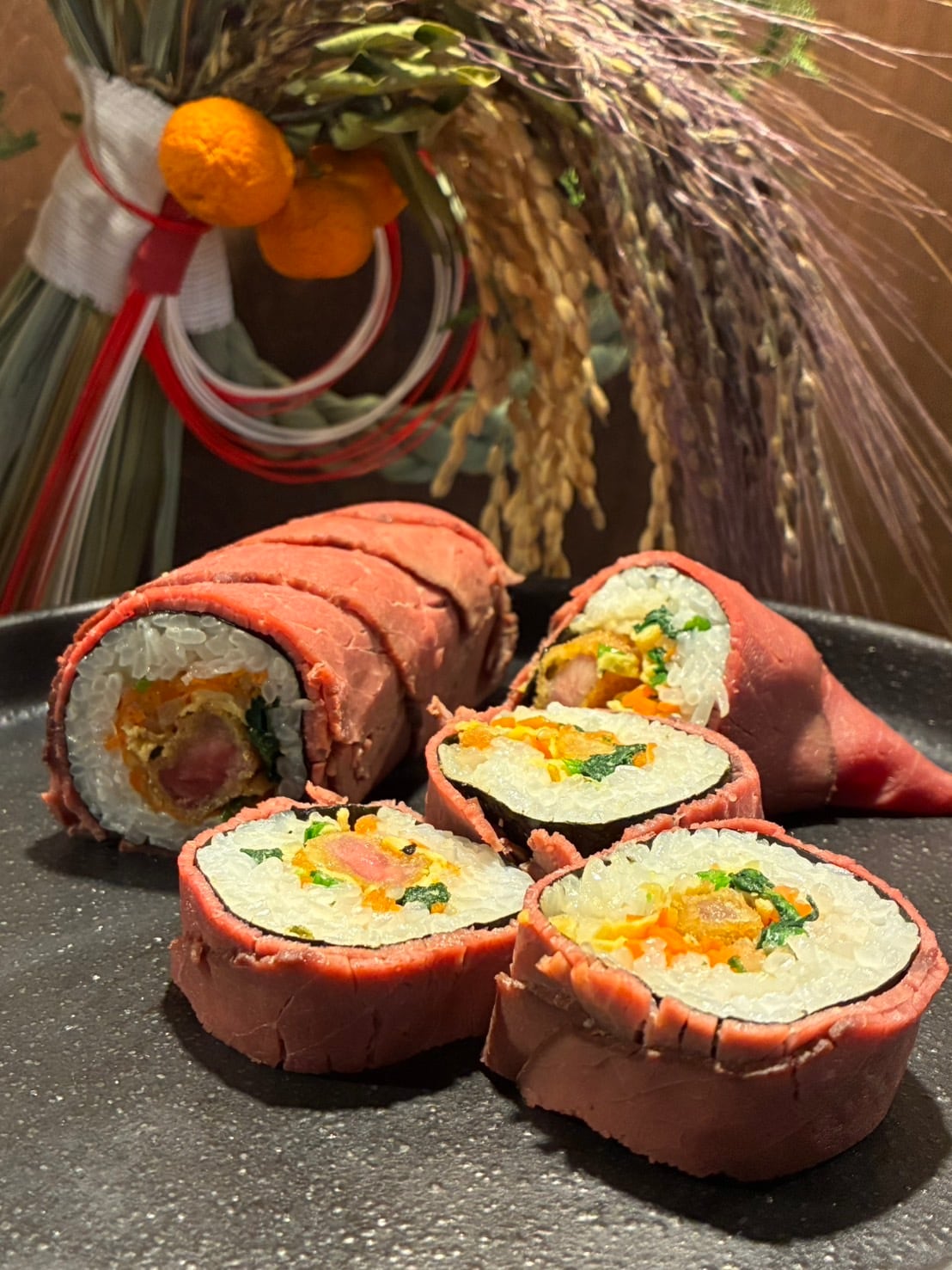 奈良を代表する大和牛の低温ローストビーフを豪快に巻いた、食べ応えのある肉巻き。